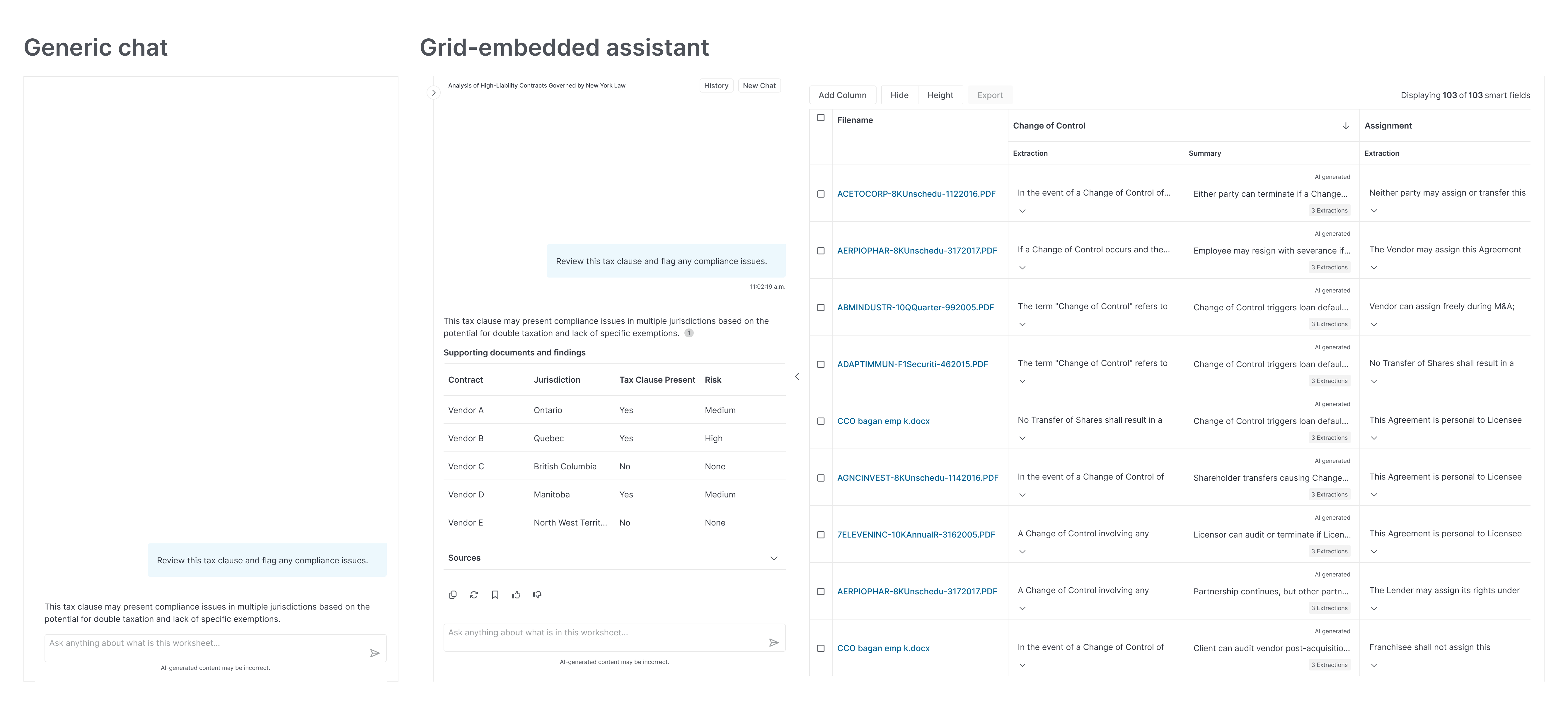 When comparing AI models, generic chat tools often give unclear answers. In contrast, a grid-embedded assistant makes scope, evidence, and verification easy to see during legal review.