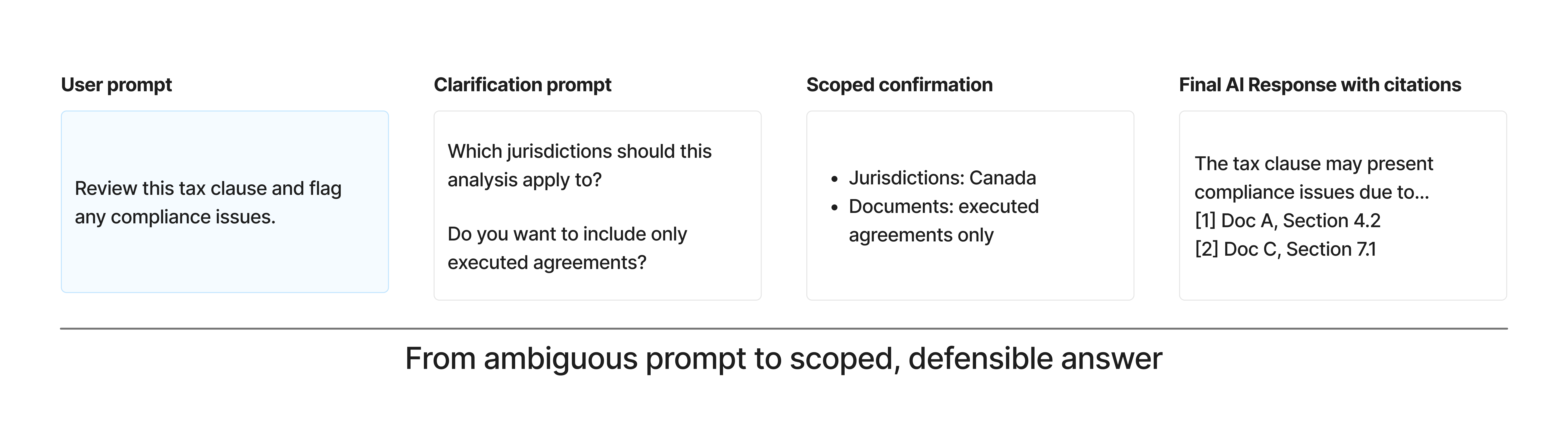 I designed an AI-assisted document review workflow for enterprise legal teams working on high-stakes, document-heavy matters. To address the risks of unverifiable AI outputs, I embedded a task-aware AI assistant within structured document grids. This approach added clear scope control, built-in clarification steps for ambiguous questions, and source-level citations to help teams verify and defend their analysis. I validated the workflows with over 12 legal teams across different practice areas. This work guided future AI features and established reusable patterns for trustworthy, efficient AI, helping teams reach insights faster while reducing the risk of errors or unverifiable results.