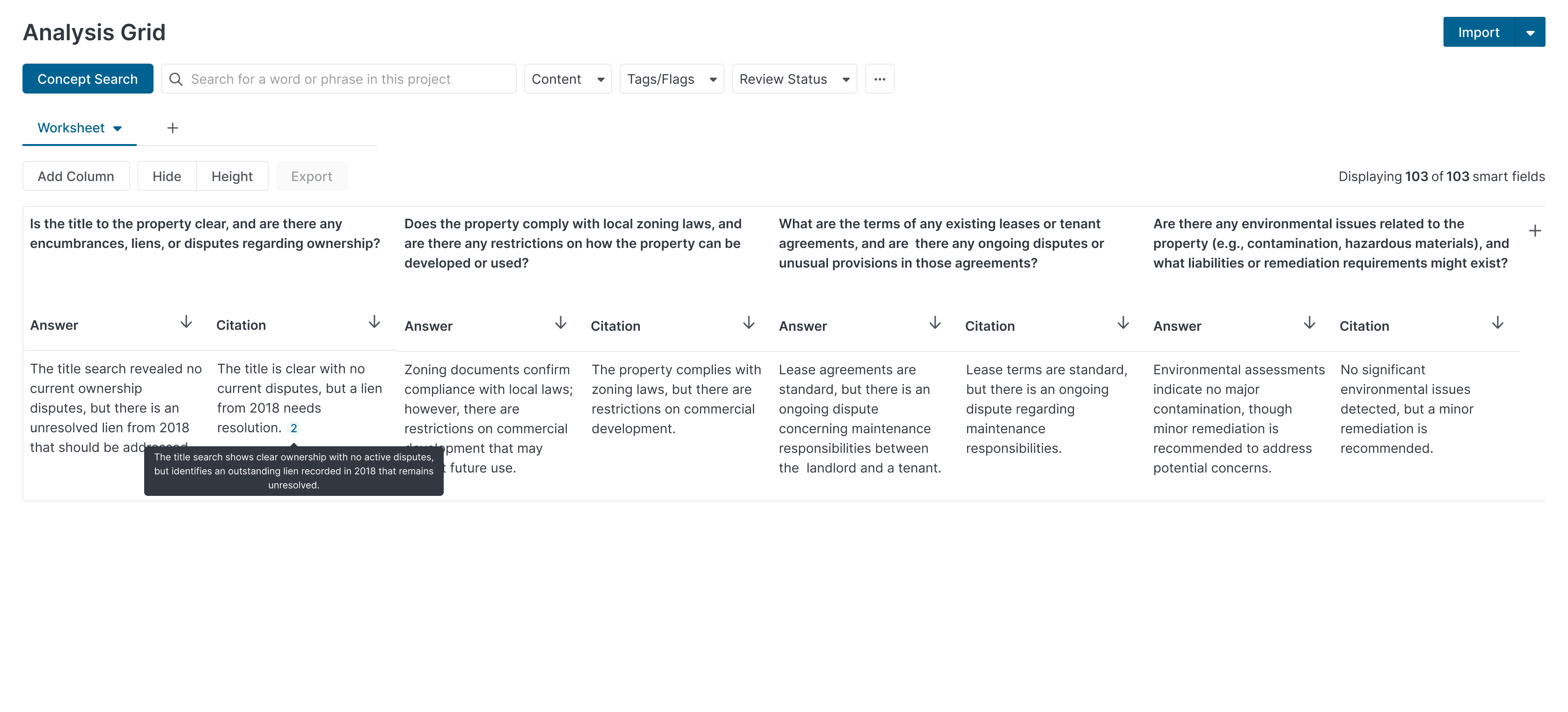 We validated the analysis grid early on and confirmed that its structured questions, focused answers, and clear citations matched actual due diligence workflows.
